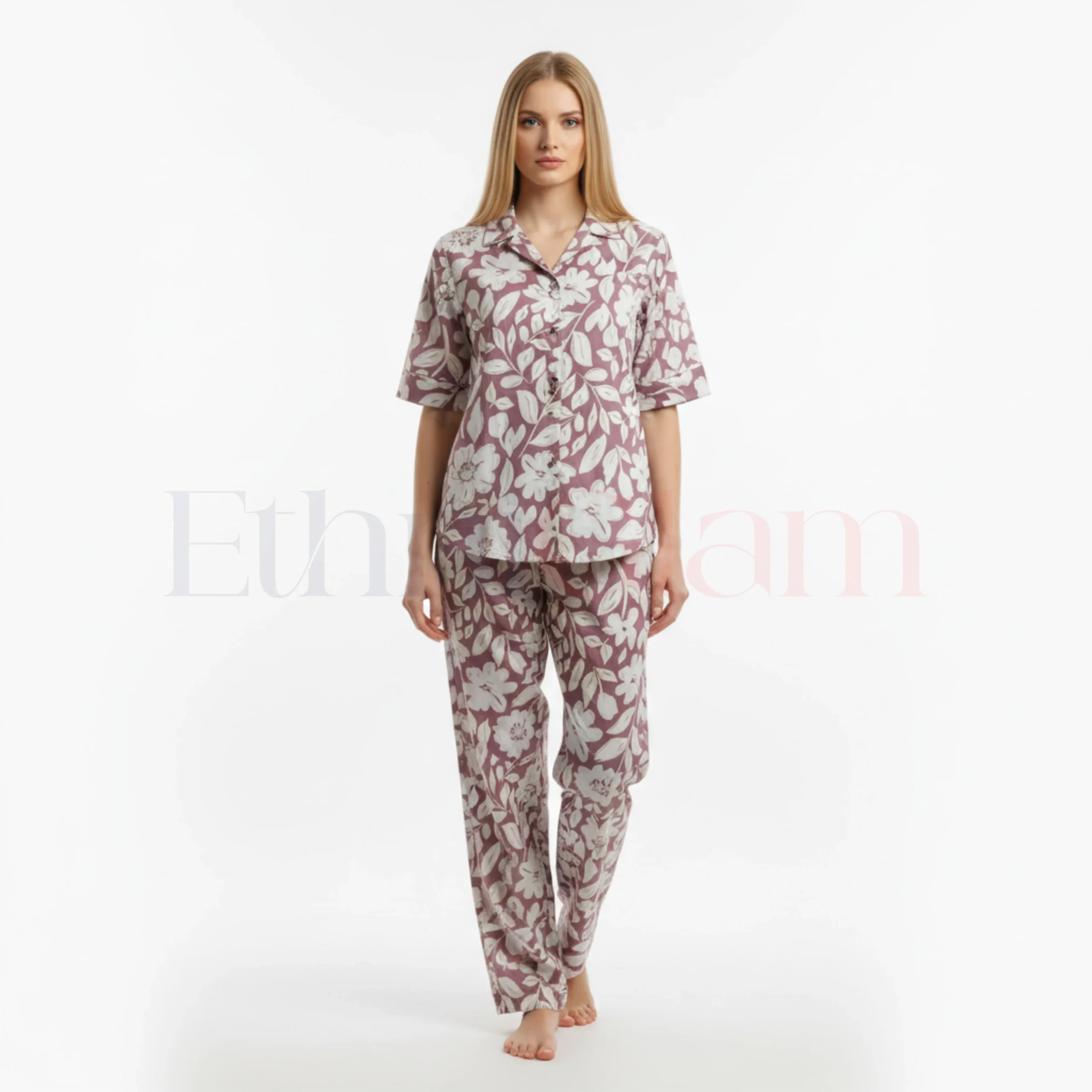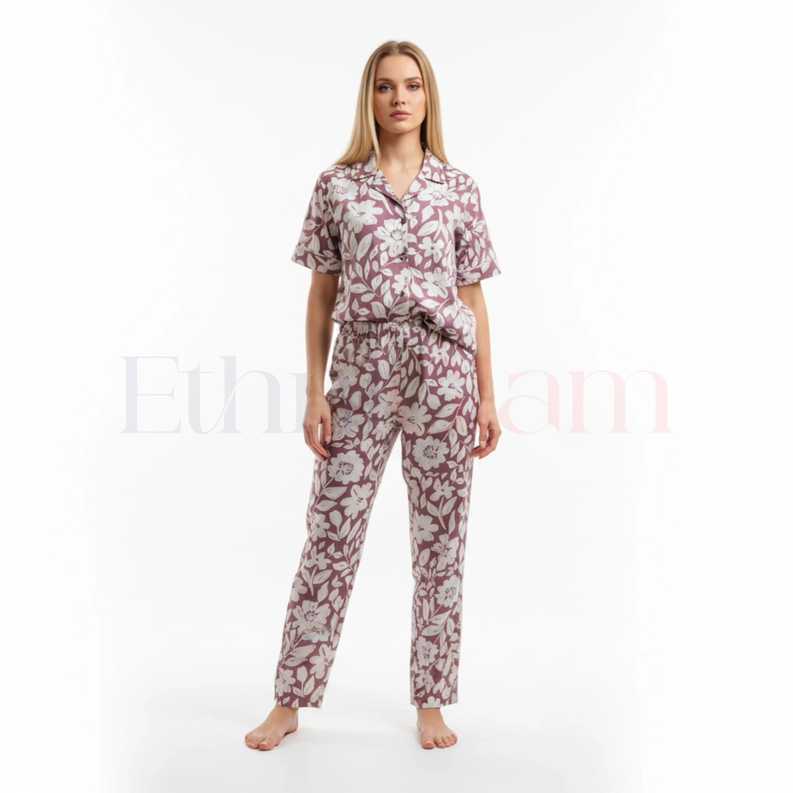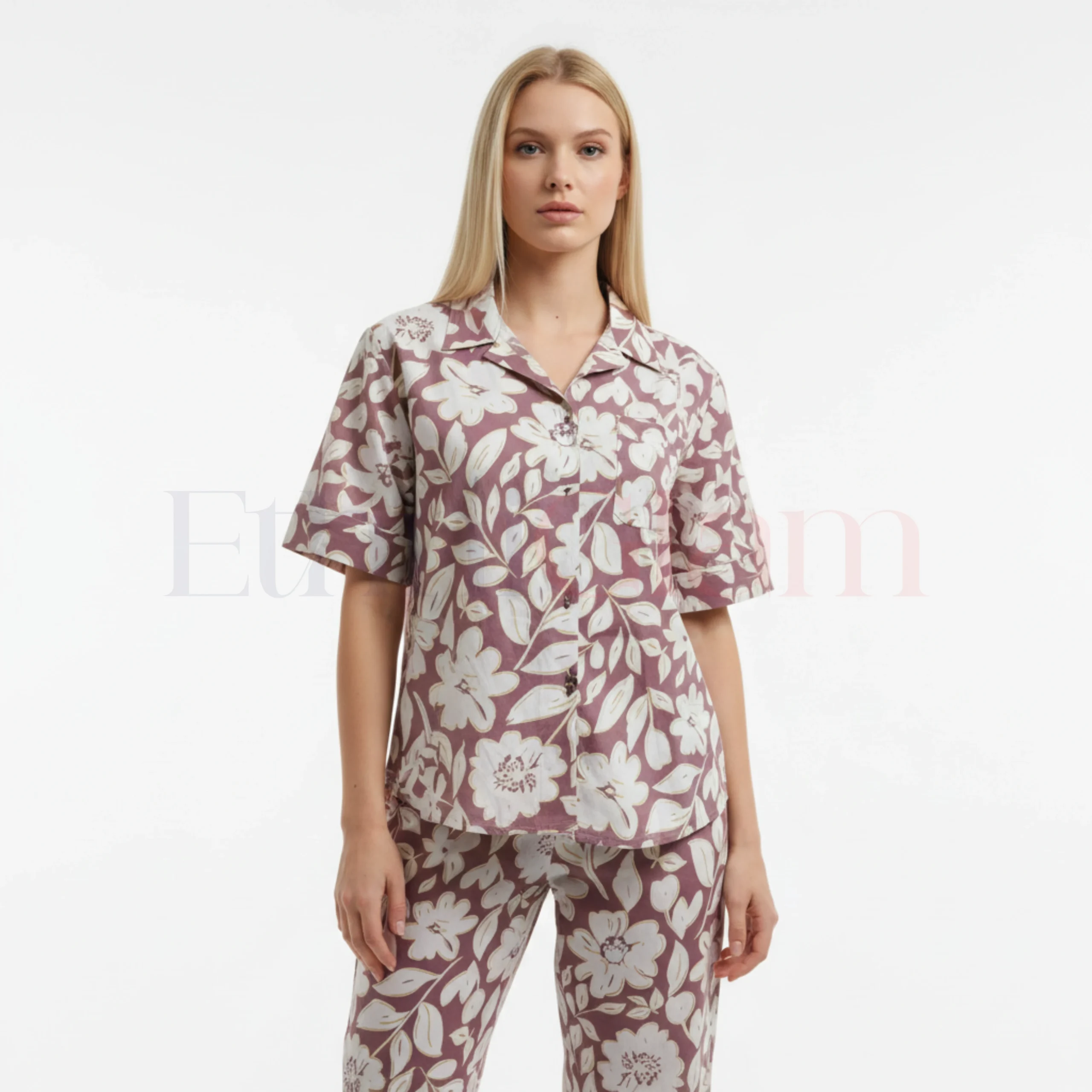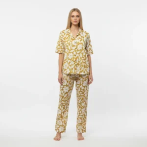 Women’s long rayon kurti pyjama set in dark blue with shimmer floral print. Includes loose-fit kurti and elastic waist pyjama with pocket. Lightweight, breathable, and non-transparent fabric.